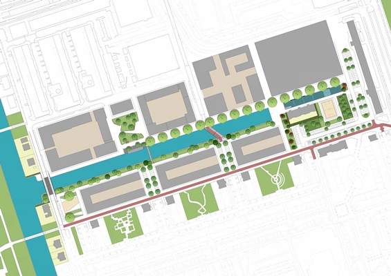 Rondom CNW zijn drie bestaande waterbegrenzingen te onderscheiden. De nieuw te graven Osdorpergracht gaat de vierde begrenzing vormen aan de zuidzijde van het CNW gebied. De noordkant van deze Nieuwe Osdorpergracht grenst aan het centrumgebied en zal daarom een stedelijke uitstraling krijgen door middel van een gemetselde kade. De zuidkant van de nieuwe gracht wordt natuurlijk ingericht met een groen talud met plasberm en verspreid staande bomen. Het talud wordt met een combinatie van gras en kruiden/bloemenvegetatie ingezaaid. Samen met de verschillende boomsoorten zorgen deze groene zones voor meer biodiversiteit. In de gracht zijn een watertrap met steiger en een aansluitende ondiepe Waterspeelgracht ontworpen om dichterbij het water te komen en zo de beleving van het water te vergroten. De Nieuwe Osdorpergracht en de waterspeelplaats gaan tevens dienstdoen als hemelwateropvang en buffer van de verhardingen uit het aansluitende deel van het centrumgebied.