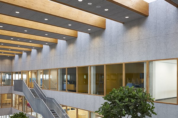Plus Basic panelen toegepast als wandpanelen in het atrium. Deze combinaties en toepassingen zorgen voor een uitstekende akoestiek met een absorptie van 70 tot 100% afhankelijk van de ruimte eisen.