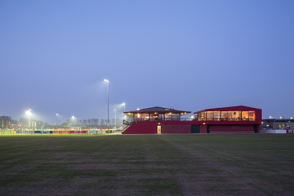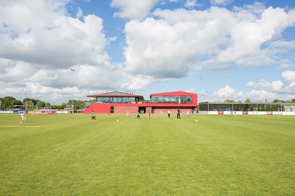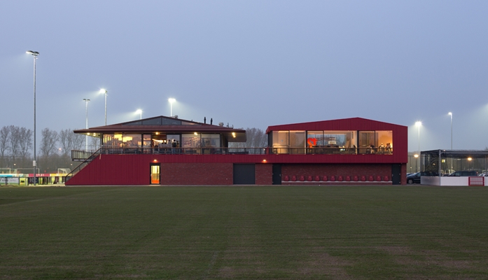 Net als in het bestaande clubhuis zijn de kleedkamers op de begane grond gesitueerd, de entrees bevinden zich in de bakstenen plint.