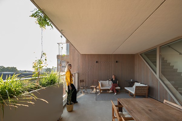 Gevel binnenzijde is van hout. Elke verdieping heeft een riant collectief terras