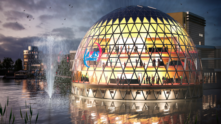 Het nieuwe bolvormige theater, dat zal beschikken over 824 stoelen, zal overdag worden gebruikt voor interne bijeenkomsten en in de avonduren voor theatershows en andere evenementen.