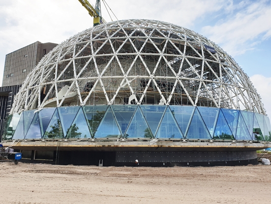De koepel (dome) is verdeeld in verschillende horizontale ringen, die weer zijn opgedeeld in een driehoekig patroon. De dome is met een diameter van 42 meter en een hoogte van 21 meter een ware eyecatcher. Elk knooppunt krijgt een lichtspot naar binnen en naar buiten toe. Zo wordt de dome ook 's avonds een opvallende verschijning. De interne betonnen koepel, van de theaterzaal, wordt bekleed met groene begroeiing.