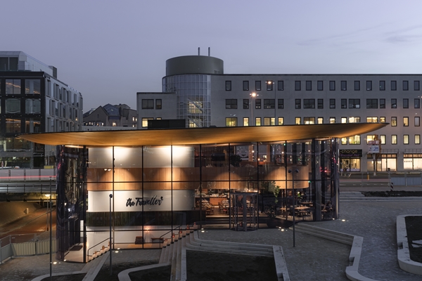 Het nieuwe The Traveller Pavilion in het Cumulus Park Amsterdam is met zijn zachte vormen en opvallende houten plafond zo ontworpen dat het naadloos aansluit op de omgeving. Het 900 m2 nieuwe paviljoen vormt in een opkomende wijk van Amsterdam Zuidoost een inspirerende en stimulerende bestemming voor medewerkers op de campus, ondernemers, omwonenden, studenten en bezoekers. In het ontwerp van Powerhouse Company heeft men gekozen voor de combinatie van een heldere glazen gevel en natuurlijke materialen en kleuren, wat zorgt voor een subtiele overgang tussen binnen en buiten.