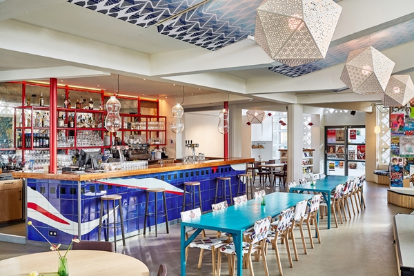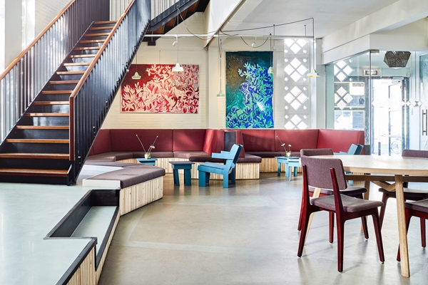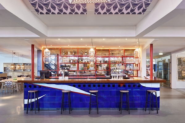 Bell Blazinbell vervaardigde de bekleding van de op maat ontworpen bank in de loungeplek onder de trap. Jeans is in patchwork aan elkaar gezet, dit patchwork heeft hetzelfde patroon als de karakteristieke ramen in de gevel en staat tegelijk symbool voor het patchwork van de samenstelling van Bos en Lommer. Uiteraard in het blauw uit het kleurpalet.