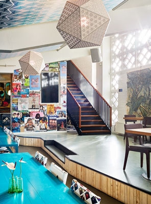 Meubels werden op maat ontworpen of besteld in alle uithoeken van de wereld. Daarmee reflecteert het interieur van Podium Mozaïek perfect de woonwijk waarin het theater is gevestigd. Waar nodig zijn de meubels flexibel uitgevoerd, zodat indeling makkelijk aangepast kan worden.