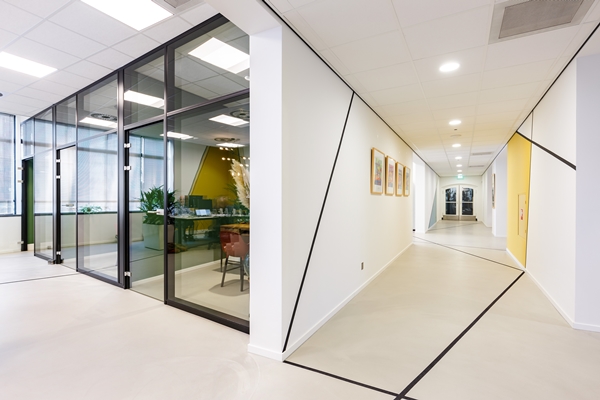 Voor de afwerking van de vloeren dachten Illse en Karin aan een gietvloer met betonuitstraling. 'We wilden in ieder geval een naadloze vloer, die alle open ruimten optisch met elkaar verbindt. Met dat idee begon onze zoektocht.' Dat zoeken werd toevallig een handje geholpen toen Petra Biemans, Account Manager Architecten en Facility bij Forbo Eurocol, bij Illse aanklopte. Petra: 'Ik ging bij Illse langs met stalen van de nieuwe kleuren van BetonDesign. Zoals altijd, vroeg ik ook of er nog iets speelde wat haar projecten betreft.' 'Nou, die timing was dus perfect', vult Illse aan. 'Toen ik Petra vertelde over de inrichting bij Bex*communicatie, wees zij me op de mogelijkheid van