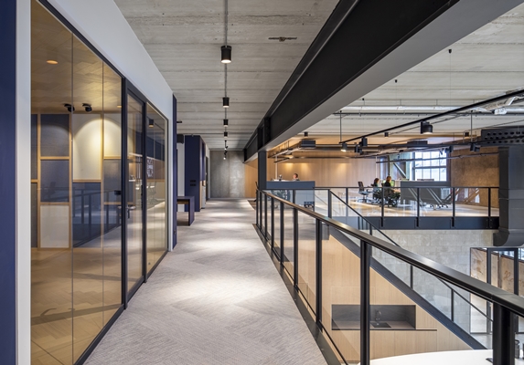 Boven het trainingscentrum ontvouwt zich het kantoor van Baars & Bloemhoff. Iedere ruimte is gehuld in een andere mix van