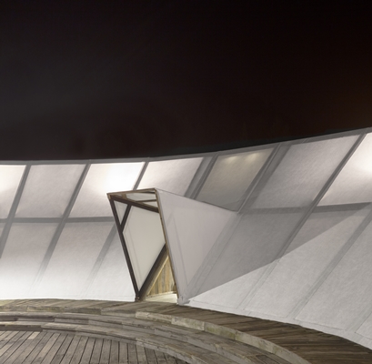 The central outdoor patio creates an enclosed platform to host learning activities and events. The white canvas ‘ring’ houses camping accommodation subdivided into segments by the three entrance points. The external corridor blends with the surrounding bamboo forest and offers an alternative circulation route while activities are happening in the central patio. The structure is elevated, keeping the ground nearly untouched. The structural