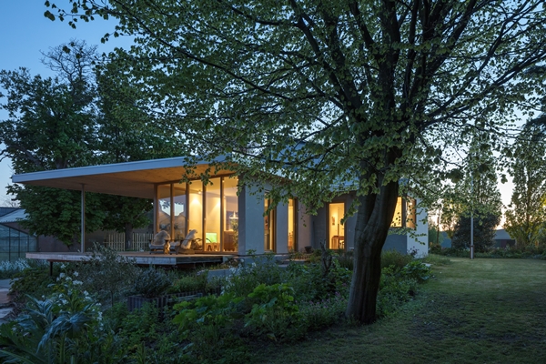 De eigentijdse uitbreiding heeft een markant overstekend dak. Dit speelt een belangrijke rol in de sturing van het zicht en in de geleidelijke overgang van binnen (het oude huis) naar buiten (het terras, de tuin met daarachter liggende bollenvelden).