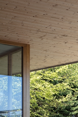 Het dak bestaat uit geprefabriceerd gelamineerd hout met daarop isolatie en een groendak. Door de keuze voor deze opbouw heeft derksen|windt de dakrand minimaal in hoogte kunnen houden. Dit zorgt volgens de architecten voor een elegant aanzicht en heeft het mogelijk gemaakt de blank gelakte eikenhouten kozijnen bijna direct aan te sluiten op het plafond.