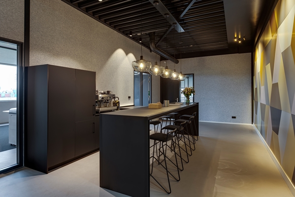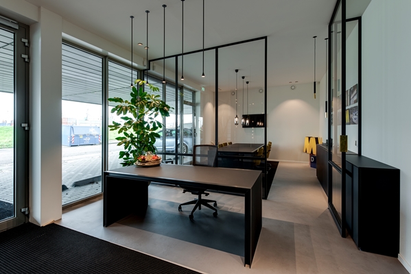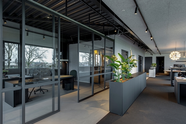 Het doel was om het vakmanschap van het bedrijf terug te laten komen in het interieur. Veel maatwerk in metaal, aluminium en brons is door Lens zelf geproduceerd. Door grote vensters is er direct contact tussen kantoor- en productieruimte. De open kantoorruimte wordt door een akoestische plafond- en vloerstrook verbonden.