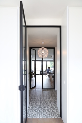 “Belangrijkste uitgangspunt in ons renovatieproject was het streven naar authenticiteit in het gevelbeeld", vertelt architect Hans De Beenhouwer van De Beenhouwer + Leonard Architecten. "Het zicht op de woning herstelden we zoveel mogelijk in zijn oorspronkelijke staat. Daarbij kozen we ervoor om de verdwenen erker opnieuw te plaatsen en de voordeur te verhuizen naar zijn oorspronkelijke positie. Binnenin gingen we dan weer voor een strakke, hedendaagse invulling. In het hart van de woning, op het gelijkvloers verhoogden we de dakplaat en brachten we een lichtstrip aan in de zijgevel van de vroeger erg donkere leefruimte. Achteraan werkten we dezelfde ruimte open naar de tuin, met een glaspartij over de volledige gevelbreedte en -hoogte."