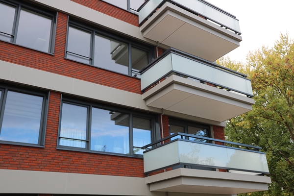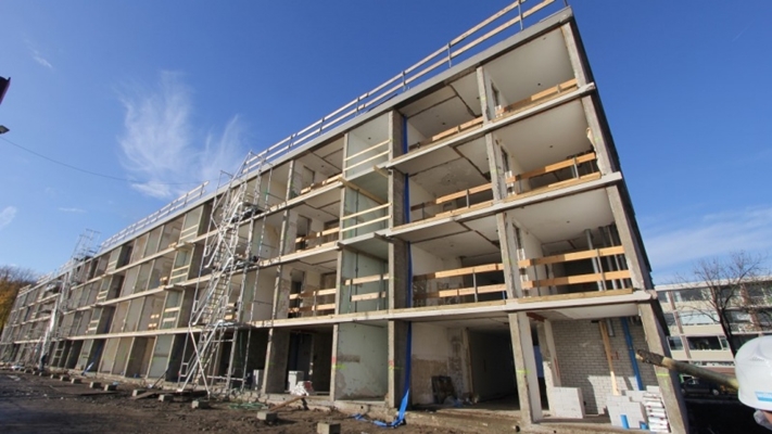 De goed geïsoleerde gevels van de portiekflat zijn deels geprefabriceerd. Oftewel: de gevelelementen zijn in een fabriek gemaakt door