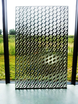 Architect Gertud Topper vertelt over het project Bediencentrale en haar ervaringen: “Behalve de diverse functionele eisen die door de opdrachtgever aan de gevel werden gesteld, was het voor mij belangrijk om in de gevel een verwijzing te maken naar de werkomgeving en daarmee de op de loer liggende anonimiteit van een brugbediencentrale te ontkrachten. In nauwe samenwerking met Metadecor hebben we, op basis van het veelzijdige MD Formatura, voor de brugbedienruimte een glanzende geperforeerde metalen huid ontwikkeld die de rimpeling en reflectie van water verbeeldt. Met behulp van 6 verschillende stempels is een patroon gemaakt van ovalen ‘lovertjes’ die omgezet zijn onder een hoek van 30 graden. Door de subtiele verdraaiing van deze metalen lovertjes verandert de gevel voortdurend van aanblik, al naar gelang de intensiteit van het invallende licht en de hoek van inkijk. Omdat alleen de lovertjes uit het gevelvlak treden ontstaat er een subtiel 3D effect dat ook overhoeks, rijdend over de provinciale weg, waarneembaar is. Vanuit de bediencentrale is er door de gevel heen gesluierd uitzicht over het nabijgelegen kanaal Omval-Kolhorn. De gevel heeft een zonwerende werking en reguleert het binnenkomende zonlicht. Dit zorgt binnen voor een gedempte en aangename sfeer.”