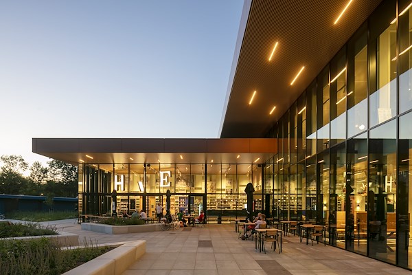 Het Huis van Eemnes is een omgeving waar bibliotheek, theaterzaal, sporthal en horeca samenkomen tot één ontmoetingsplek en dat vraagt om een ontwerp dat verbindt. Met dit uitganspunt creëerde MoederscheimMoonen Architects een gebouw waarin de bibliotheek en de brasserie een centrale plek vormen en direct in verbinding staan met de verschillende multifunctionele zalen, het theater en de sporthal. Bij binnenkomst bevinden bezoekers zich dus meteen in dit bruisende hart van het gebouw.