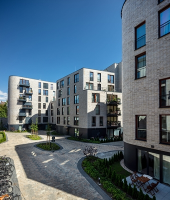 Aan de noordrand van Prenzlauer Berg in Berlijn verrees recentelijk Das Gotland, een wooncomplex met een mix van twee- tot vierkamerwoningen. Aan de straatzijde zette architectenbureau Gnädinger Architekten de bestaande blokrandbebouwing door. Aan de achterzijde ontstond een besloten hof met drie kleinere woningbouwvolumes. De grijsachtig-wit tot blauw genuanceerde Hagemeistersortering „Farsund HS“ bezorgt de nieuwbouw een lichte toets, compleet met gemetselde afgeronde hoeken.
