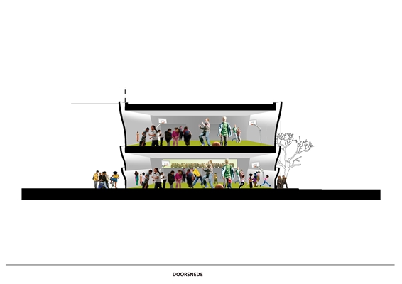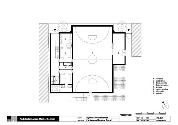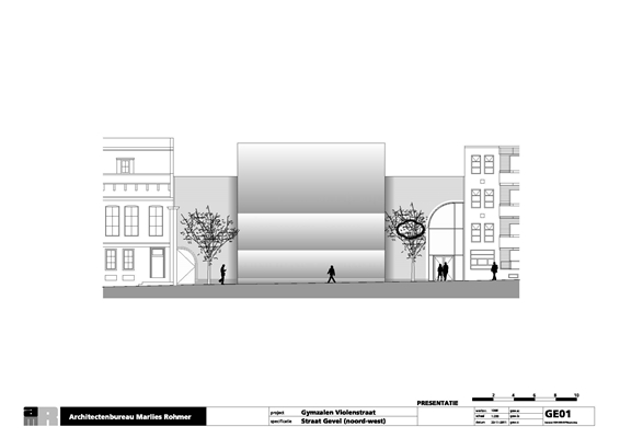 De Violenstraat in Groningen is een fijnmazige stadsstraat. In dit straatje wordt een relatief grootschalig en gesloten complex met twee gymzalen gesitueerd. Het spanningsveld tussen bestemmingsplan en programma dicteert een gestapelde oplossing. Een positionering in de diepterichting van de twee gestapelde zalen kent een reeks aan voordelen. Het volume manifesteert zich relatief bescheiden in het straatbeeld en er ontstaat een mogelijkheid dit ‘sportblok’ te verzelfstandigen van zijn buren, waardoor het minder massief wordt. Door kleedkamers en toestelbergingen naar achteren te plaatsen ontstaan twee kleinschalige pleintjes, beide met een boom. Groepen kinderen kunnen zich hier opstellen alvorens naar binnen te gaan. Op deze manier voegt het sportblok zich op een vanzelfsprekende manier in het fijnmazig stadsweefsel.