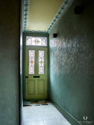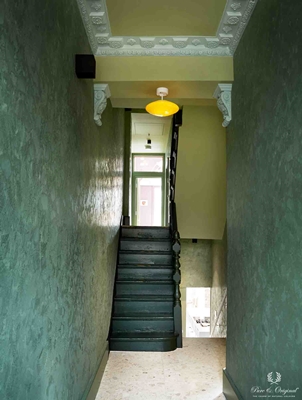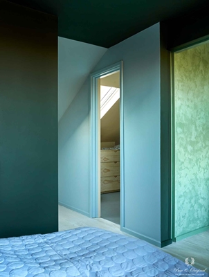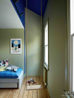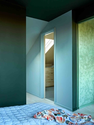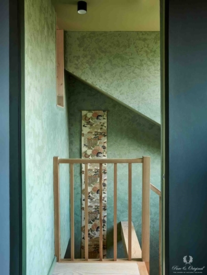 Walls: Hop Classico Hallway to lower floor: Olive Drab Licetto Stair railing: Poetic Blue Traditiona