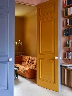 Yellow walls and ceiling: Old Ocre Classico Pink walls: Soft Flamingo Classico Yellow doors: Old Ocr