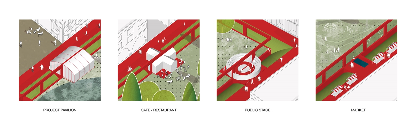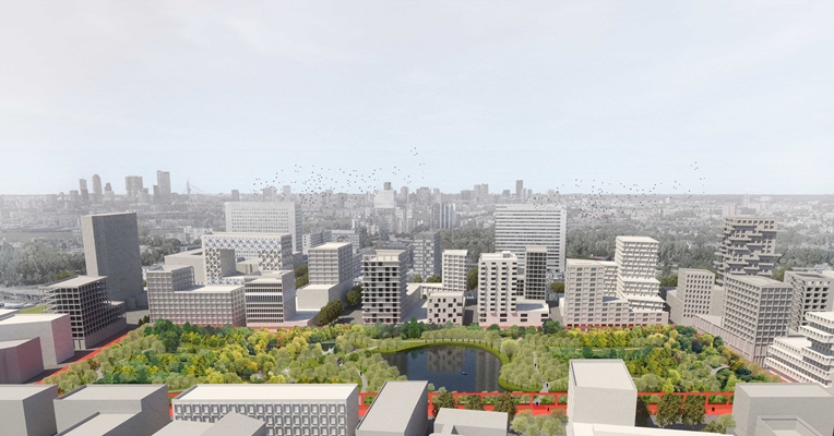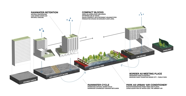 Met hoge dichtheid en levendig stadsleven als doel en duurzame stadsontwikkeling als een voorwaarde, stellen we voor om het beste van twee werelden in elkaars directe nabijheid te maken. Team Brainpark presenteert een multifunctionele stad, compact georganiseerd rond een groot openbaar park. We stellen een minimale wijziging van de bestaande eigendomsgrenzen voor waardoor ieder kavel op eigen initiatief ontwikkeld kan worden. De top-down focus van het masterplan ligt op een sterk landschappelijk element dat de harde grens van private kavels naar publiek park markeert. Om te voorkomen dat de hoge dichtheid van Brainpark tot stedelijke oververhitting leidt, wordt het regenwater van de kavels centraal naar het park geleid waar het wordt opgeslagen en gebruikt. Naast zijn sociale functie werkt het park hierdoor als stedelijke 'airco' voor de hele wijk.