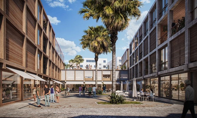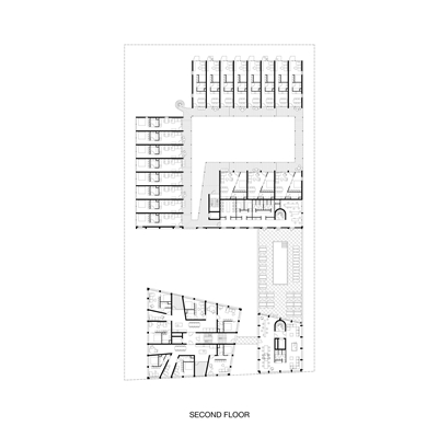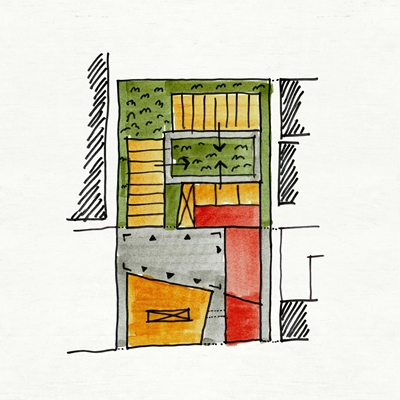 De stedelijke inrichting voorziet in een openbaar toegankelijk plein aan de voorzijde en een groene binnenplaats met alleen woningen aan de achterzijde. Alle functies zijn zo gepositioneerd dat er een optimale relatie met de omliggende ruimte ontstaat. Om het stadsleven naar het plein te trekken en de openbare ruimte te activeren zijn de straat en het openbare plein op de begane grond volledig omsloten met openbare functies als supermarkt, restaurant en winkels. Op de eerste verdieping langs het plein zijn kantoorwerkplekken beschikbaar. Het gemeenschappelijke dakterras, dat alleen toegankelijk is voor bewoners, ligt langs het plein waardoor het visueel deel uitmaakt van de openbare ruimte. Rond dit dakterras zijn gemeenschappelijke ruimtes als wasruimte, sauna en fitnessruimte gepositioneerd.