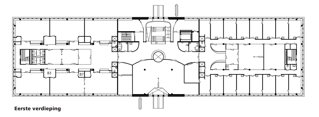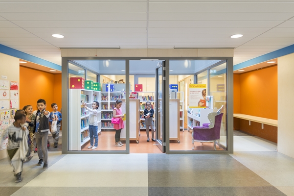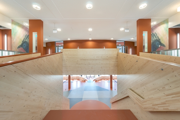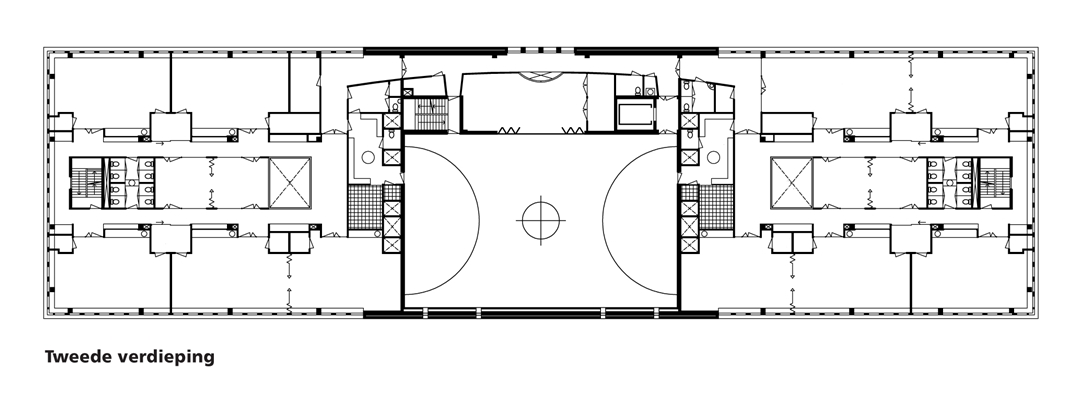 Op de wat lagere bergingen is de gymzaal – die 5,5 meter hoog is – gepositioneerd. Dit blok met bergingen, aula en gymzaal in het midden van het gebouw is geluidgedilateerd van de omliggende lokalen: een kolommenstructuur met flexibel stelsel van groepsruimtes, ontsloten middels een heldere routing, een rondom lopende gang, welke middels een ‘bloemraam’ uitzicht heeft op de Bos & Lommerweg.
