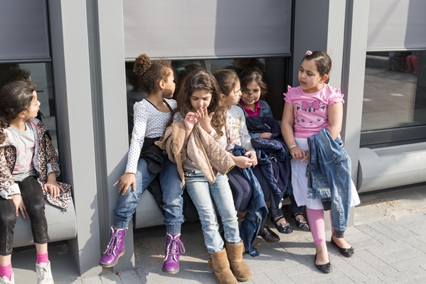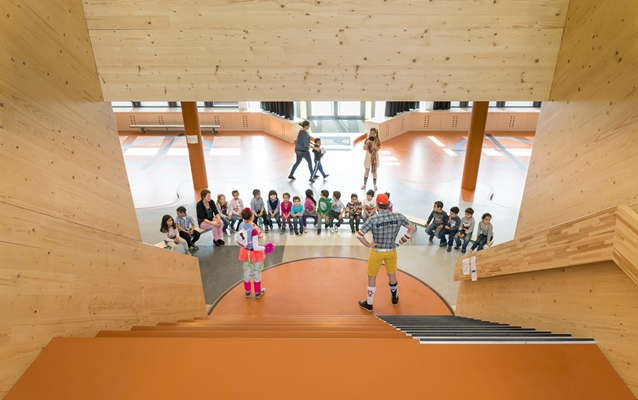 De basisschool is gesitueerd op de begane grond en de eerste verdieping. De school is gedrapeerd om een verdiept speellokaal/aula en een blok bergingen voor de woningen.