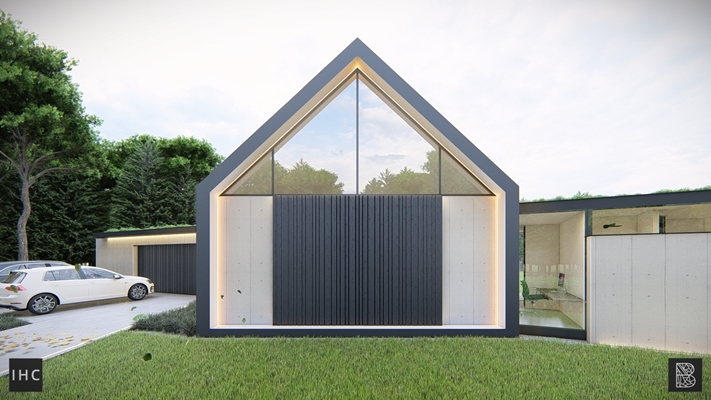 De woning bestaat uit 2 volumes. Het hoofdvolume heeft een traditionele vorm maar zweeft over het kavel. De tweede vorm is een moderne vlak volume was diagonaal door het de hoofdwoning heen gaat. Hierin zit aan de ene kant de garage en berging verwerkt en aan de andere kant het kantoor en de master suite.