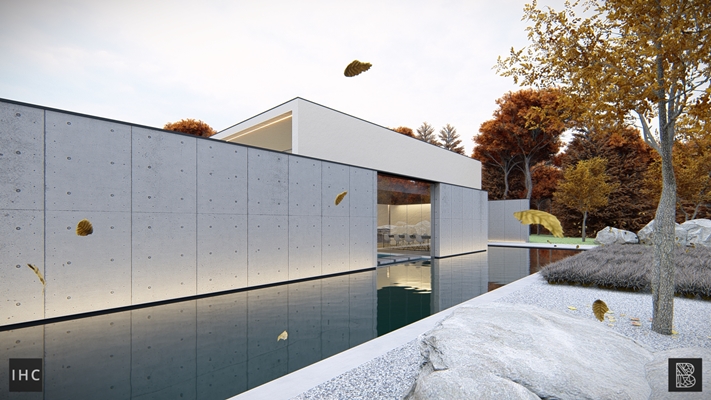 Water is een essentieel onderdeel in dit ontwerp. De vijver zorgt voor de reflectie van de vlakken in de gevel. Daarnaast accentueert het de lengte van de woning. Het water begint als een vijver aan de voorzijde wat doorloopt naar binnen in de vorm van een binnenzwembad. Deze wordt gescheiden met een glazen wand met het buitenzwembad. Door de overstroming van het buitenzwembad wordt een waterval gecreëerd die uitkomt in de vijver van het gasten verblijf.