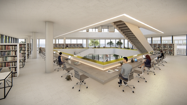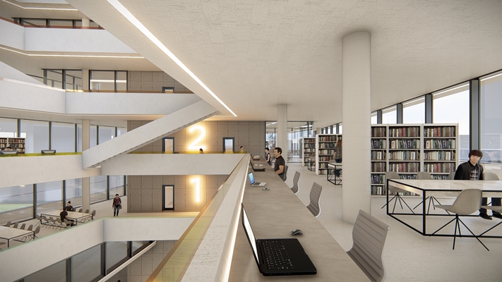 The rotating voids correspond with the rotating floors wich creates a lot of space and connects all floors together. The collored translucent glass on top of the balustrade indicates the zone of quietness.