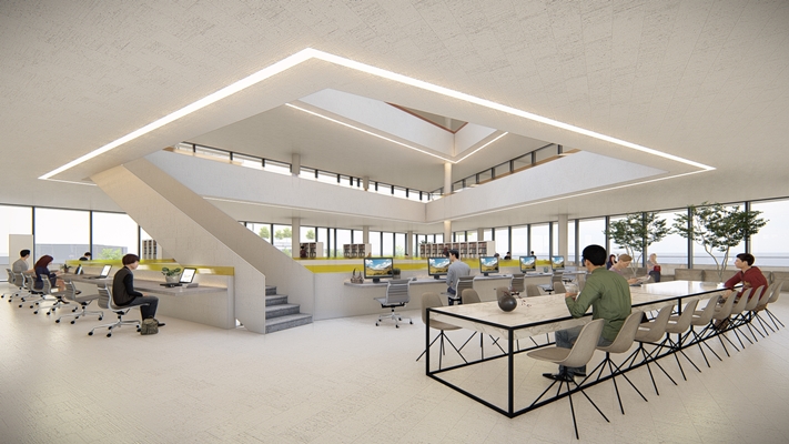 With the big staircase you enter the the first floor. This immediately gives a minimalist atmosphere. It offers an open structure with several workplaces. The concept with the quiet and private zones is clearly visible. The higher you get, the more individual and closed spaces.
