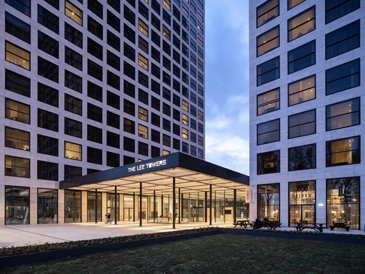De Lee Towers werden eind 2018 opgeleverd en zijn met een bezetting van ruim 75 procent een groot succes. Van Ekeren zegt in het ontwerpproces en de uitvoering veel aan Metaglas te hebben gehad. “Op twee manieren eigenlijk: voor de geveloplossing zat hun meerwaarde vooral in het meedenken over (en engineren van) de technische details. Daarnaast hebben ze ook ons idee voor de gemeenschappelijke lobby van het complex verder gebracht door mee te denken. Een luifel met daaronder twee glazen wanden verbindt de torens met elkaar. Wij bedachten om de kozijnen in de stalen kolomstructuur te integreren, Metaglas kwam met ideeën voor de weggedetailleerde vliesgevel die wij wilde maken. Alles oogt nu naadloos verbonden.”
