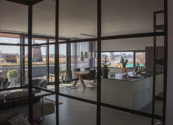 Haar woonkamer is op de verdieping zodat de bewoners weids uitkijken over de Hoornsevaart met de vier overgebleven strijkmolens van de Zes Wielen.