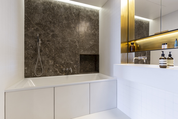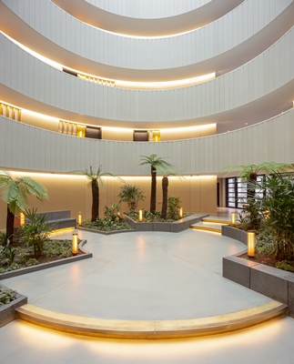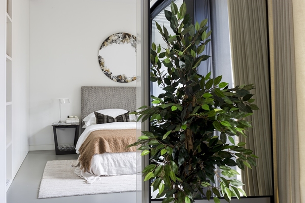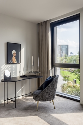 van het gebouw op een elegante manier in de interieurs te verwerken. Er is daardoor ook veel gebruik gemaakt van industriële materialen zoals hars, staal, messing, hout en beton. Voor veel van de appartementen is er gekozen voor