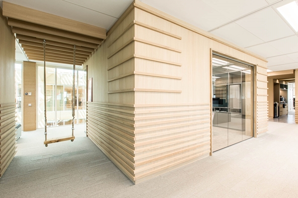 De wanden van de gesloten ruimtes zijn bekleed met massief eikenhouten latten, die aan de onderkant dichter op elkaar zijn geplaatst. Plaatselijk zijn delen van de wanden bewust leeg gelaten, waardoor geen aanzicht hetzelfde is. Deze dynamiek zorgt voor variatie op de achtergrond van de open ruimtes. De binnenkanten van de wanden hebben akoestische panelen die voor 60% zijn gemaakt van gerecyclede petflessen.