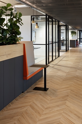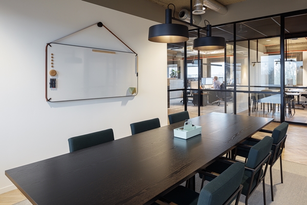 In het kantoor dient de 35 meter lange gang als verkeerszone én als afscheiding van de werkzones. We hebben ervoor gekozen hier een lange op-maat-gemaakte kast te plaatsen met daarin diverse overlegfuncties, zoals zitbankjes en statafels. Hiermee doorbreken we niet alleen de lange gang, maar worden de werk- en overlegmogelijkheden ook dynamischer.