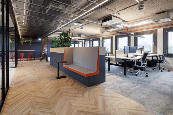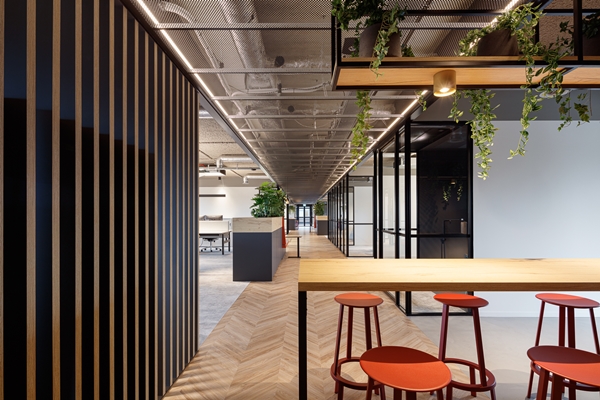Het basis kleuren- en materialenpallet in het ontwerp bestaat uit antraciet, zwart en hout. Door de basis rustig te houden, was er ruimte voor tomaatrode accenten, een kleur uit de huisstijl van TTG. Met veel ruimte voor planten is het een warm en stoer kantoor is geworden.
