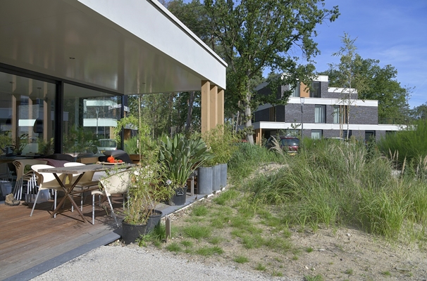 Elke bosvilla herbergt een compacte (starters)woning van 80 m², een levensloopbestendige woning (110 m²) en twee eengezinswoningen (130 m²), allemaal toegerust met een privé veranda annex buitenkamer. Alle woningen liggen op de hoek en hebben een dubbele oriëntatie. De in het volume geïntegreerde veranda’s slaan een brug tussen de woonruimte en het omliggende landschap. Grote glasvlakken met brede schuifpuien zorgen voor een naadloze overgang tussen de woonruimte en deze buitenkamer.