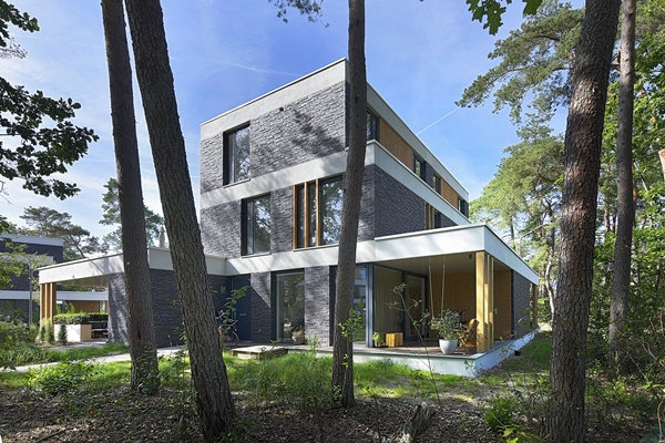 De gevels van de bosvilla's zijn vormgegeven als een robuuste huid, toegesneden op de bosrijke omgeving. De villa's hebben aan de façades donkerbruine aluminium puien, gebeitst hout, witte betonbanden en de donkere Hagemeistersortering Manchester GT + FU. Ubels: "Op de eerste schetsen die we van dit ontwerp maakten, zie je al een stoere huid, een referentie aan de ruwe bast van de dennenbomen op het terrein, een huid met textuur, massief, met als contrast de horizontale betonbanden."