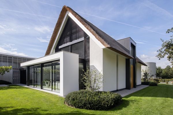 Op het eerste aanzicht lijkt de moderne gezinswoning voor wel bijna de helft uit glas te bestaan. De huiseigenaren en hun vier kinderen kunnen als het ware baden in licht. Dat was ook hun wens, vertelt architect Lenny van de Sande. ‘Een moderne uitstraling, een rieten kap en veel licht en ruimte waren de belangrijkste eisen van de opdrachtgevers.’