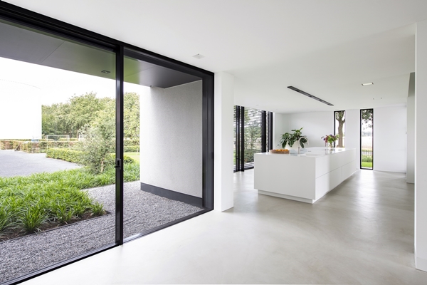 In het creëren van de strakke lijnen en vormen had Van de Sande volledig de vrije hand, maar in het totale ontwerp en de ligging van de woning was de locatie leidend, vertelt ze. ‘Het huis hoort bij het tuindersbedrijf dat vlak achter de woning ligt. Het bedrijfspand sluit de woning aan die kant af. De voorzijde van het huis biedt vrij uitzicht, maar ligt aan een vrij drukke weg. De tuin is daarom gelegen aan weerszijden van het huis, waarop we besloten om de zijgevels zo open mogelijk te maken.’
