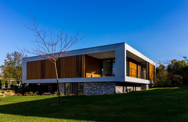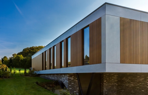 In het Limburgse landschap ligt deze luxe privé woning. De achterzijde van de woning heeft een prachtig uitzicht naar de wei. De gevel is bekleed met Swisspearl Patina Original P020.