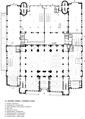 Zecc doorbrak met Rijnboutt de geslotenheid van het oude PTT-hoofdpostkantoor. Verbinden was en is het credo. Vroeger werden hier brieven verstuurd en zorgden dames op zolder voor de telefoonconnectie. Nu is het een plek om elkaar tegen te komen, de bibliotheek te verkennen en de stad te ontmoeten. Om het gebouw fysiek en visueel te ontsluiten moest het casco zich ‘openen’, waardoor bezoekers als vanzelfsprekend hun weg door de bibliotheek vinden. De centrale hal is van een overweldigende schoonheid met een rijkdom aan vorm, licht en ambachtelijk materiaalgebruik. Deze hal is een bruisend plein geworden en verlengstuk van de stad. Vanuit deze centrale hal zijn zes nieuwe openingen gemaakt boven de kenmerkende historische deuren, die voorheen gesloten bleven voor publiek. Die nieuwe lichtopeningen begeleiden je naar de zijvleugels en nodigen je uit om op reis te gaan door de bibliotheek.