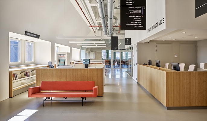 Door het versmelten van oud en nieuw én het creëren van nieuwe doorzichten en extra doorgangen tussen de leeszalen ontstond een alternatieve omloop met vergezichten over de historische binnenstad. “De sequentie van lage en hoge ruimtes – in de hal en de kamers – creëert een ruimtelijke spanning die uitnodigt om de bibliotheek en haar omgeving te verkennen. Die structuur is tijdloos en de kracht van het ontwerp van Joseph Crouwel. Maar het past niet in een bibliotheek van deze tijd waarin overzicht juist belangrijk is. Door brede doorgangen te maken in de hoeken van de kamers is het karakter behouden, terwijl in de breedte meer transparantie ontstaat.