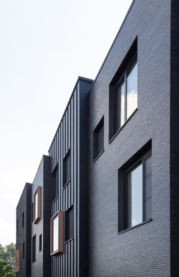 De verticale staalplaten contrasteren met de horizontale belijning van de langformaat baksteen, die stootvoegloos en op een dunbedmortel is verwerkt. Deze gevelmaterialen en de verspringende vierkante zwarte aluminium kozijnen zorgen voor een neutrale achtergrond. Zwart; waardoor details vervagen en schaduwwerking samensmelt met de achtergrond en daarmee de illusie van het collectief versterkt wordt.