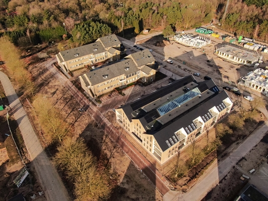 Langs de monumentale entreeroute vormen de twee bestaande legeringsgebouwen en het nieuwe cluster een sterke eenheid. De integratie van een aantal essentiële elementen van de kazernegebouwen in de nieuwbouw versterkt de samenhang tussen oud en nieuw.