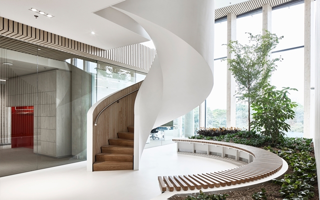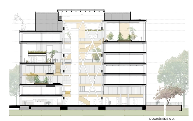 In het negen bouwlagen tellende gebouw bevinden zich dubbelhoge binnentuinen als een spiraal rond een centraal atrium. Deze informele Green Plaza’s zorgen voor contact met elkaar en met de groene omgeving