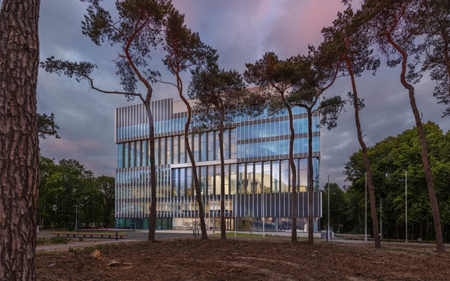 De nieuwbouw torent uit boven de prachtig bosrijke omgeving in de regio Venlo – de thuisbasis van het bedrijf. Vanaf de A67 kun je de nieuwbouw goed zien. Dat komt door de krachtige ritmiek die we in de glazen gevel aanbrachten. Het gebouw is zeer transparant. Grote glaspartijen zorgen voor een aangename lichtinval en een onbegrensd zicht op de omgeving. De kantoren hebben een glasgevel met verticale lamellen. Bij de binnentuinen is daarentegen een glasgevel in zaagtandpatroon toegepast. Zo is een expressief gebouw ontworpen, dat buiten laat zien wat er binnen gebeurt.