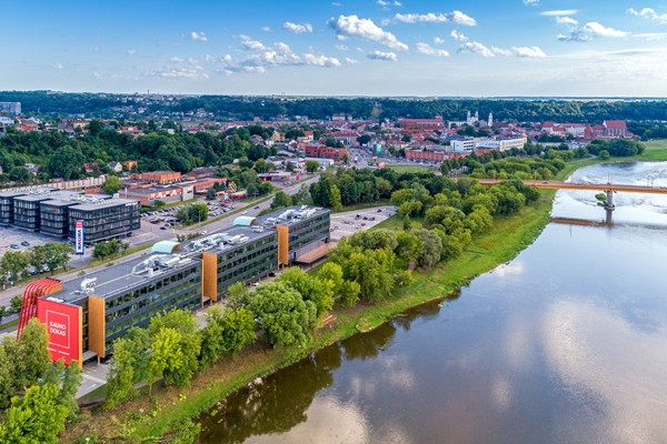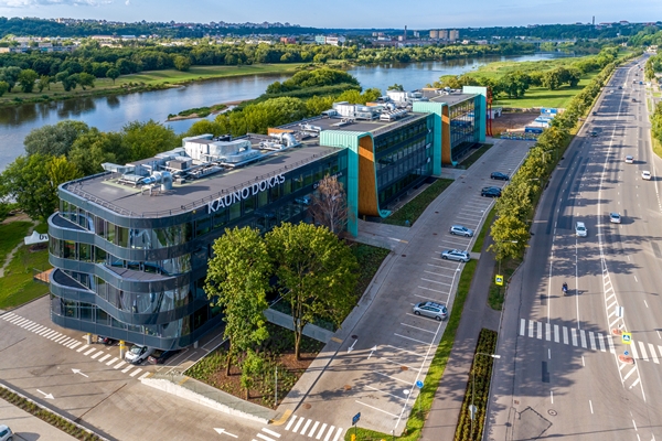Like a riverboat, the Kauno Dokas office building is situated on the banks of the Neris, a river which flows into the Memel only a few metres downstream. The ‘steamer’ is one of many measures taken to safeguard the future of the Lithuanian city of Kaunas. The old town and riverside landscapes may be truly beautiful but not enough to stop people leaving Kaunas and relocating predominately in Western Europe. Over the years, the city has been implementing renewal programmes and new building projects for many well-known companies, and gradually they are setting up in Kaunas. The new building draws attention to both the river currents and to the currents of change which the city is experiencing. Breaking with architectural tradition, the architects emphasize the symbolism of renewal. The dark glazed façade of the oblong block with its curved ends contrasts with the city’s red and yellow brickwork and rendered façades. The building, a steel-concrete frame construction is mounted on stilts. At high water, it really seems to float on the river like a ship. Different building heights and sinuous projecting roofs cut through the stark building volume like waves. Carving deep into the building interior, they indicate its three entrances and stairways. On the inside, they are clad with ALUCOBOND® legno elements in wood décor. They emphasize the maritime character of the building and stand out against the dark, urban-looking glass façade. Oxidised copper on the exterior references the city’s church roofs. Wide concrete walkways lead from the access road to the three entrances. The building also sets standards ecologically: it is cooled with water from the river and also uses geothermal energy for heating. This makes it the first commercial building in Lithuania to achieve energy standard A+. In addition, the owners had the public shore area redesigned to include a playground, benches, footpaths and a connection to the cycle path network. The green riverbanks and water meadows along both rivers unify the whole city of Kaunas and make it a pleasant place to live. This is indeed the right location for a future-oriented highlight.