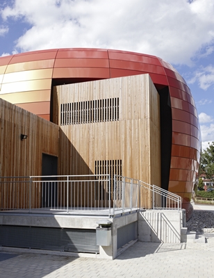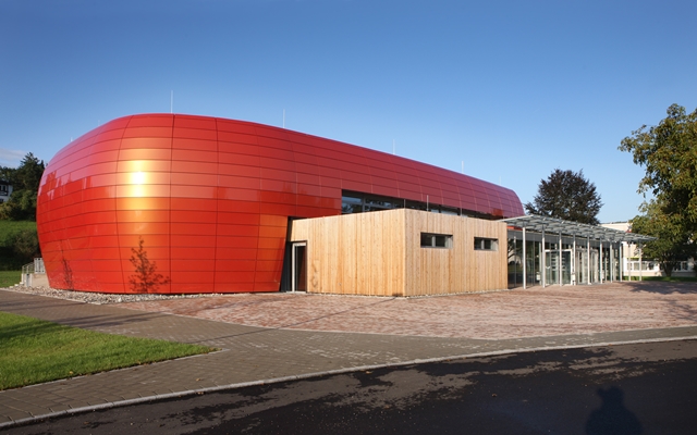Engen, a small town in the western region of Lake Constance, is characterised by pointed rust-coloured roofs and green hills. But now there is a new building; Engen’s Stadthalle is both out of the ordinary and understated. As a multi-purpose hall, it plays an important role in the town’s political, cultural and sporting life. It offers space for school sports and school catering, for concerts, seminars and town council meetings. The challenge the architects faced was how to emphasise the importance of such a significant building without upsetting the relatively homogeneous overall image of a city whose structure has evolved through history. What sort of highlight is suitable and what is the correct balance? The whole building is a “not only but also”, in terms of its use, but also in its design: the architects opted for a moderate height and a two-part structure, in order to reduce the mass of the building and to adapt it to its environment. The architects have echoed the typical division found in surrounding buildings but with a contemporary interpretation. The hall’s base, comprising entrance area and side rooms, is rectangular. Its façade in warm-yellow wood references the neighbouring yellow and pink plaster façades. The straight lines of the matt weathered timber cube are also typical of the rural architecture around Lake Constance and Alpine region. The roof of the multi-purpose hall arches over the base right down to ground level. It is clad in ALUCOBOND® spectra Cupral tray panels which, depending on how the light falls, shimmer in different shades of orange and emphasise the special character of the building. Two contrary but contemporary architectural approaches are combined in the base and roof: The wood-concrete architecture based on traditional, regional craftsmanship and the curved ALUCOBOND® façade, which was created in a high-tech production process. Software individually calculated the substructure and each façade element before they were cut and formed by CNC machines. Tradition and high-tech go hand in hand.